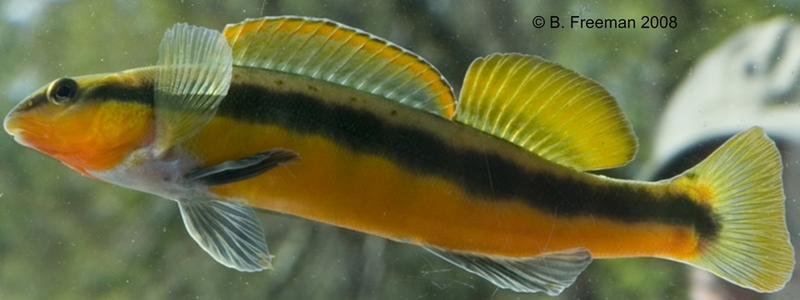 One of the largest darters with a maximum total length exceeding 17 cm (6.7 in), the tangerine darter takes its common name from the brilliant orange coloration that adorns the belly and underside of the head of adult males. Females and juveniles are less intensely colored with yellow on the undersides. Both sexes have dark blotches that blend together to form a dark stripe along the fish's sides, and a single row of small dark spots above. The dorsum is tinted yellow; the dorsal fins are bright orange in males and yellow in females. Males may retain the orange coloration on their bellies past the spawning season and throughout much of the year.