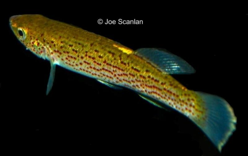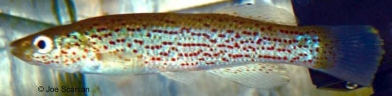 The stippled studfish is a light-gold topminnow with silver-blue sides marked by short interrupted rows of dark red to reddish-orange spots. The paired fins are blue-gray, and the caudal and dorsal fins lack marginal black bands. During the breeding season the flanks of this species turn sky blue, fading to dark blue-brown dorsally and to white below. Adults can reach 120 mm (4.7 in) total length. A reproductive male is shown above; both reproductive and non-reproductive males are shown at the bottom of the account.