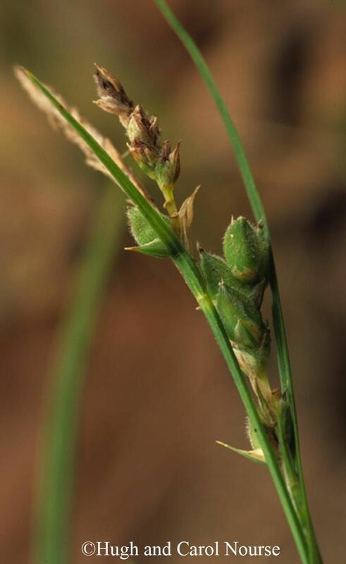 Perennial, grass-like herb forming loose clumps connected by slender underground stems (rhizomes). Flowering stems are 5 - 16 inches (13 - 40 cm) tall, with 3 - 8 basal leaves. Leaves are 2 - 14 inches (5 - 35 cm) long, with a hairy, reddish, basal sheath encircling the stem. Leaf blades are less than 0.2 inch (2 - 4.5 mm) wide, and are softly hairy near the base, W-shaped in cross-section when young, and with 3 prominent veins on the upper surface. Male-flowered spikes are up to 0.8 inch (8 - 20 mm) long, solitary at the top of the flowering stem, and covered with pale, papery scales with a green midvein. Female-flowered spikes are 0.25 - 1 inch (6 - 27 mm) long, 2 - 3 per stem, held below the male-flowered spike, each spike with 5 - 25 fruits, the scales oval and 3-ribbed with a pointed tip. The body of the fruit is less than 0.25 inch (4.5 - 6 mm) long, with a short stalk and elongated tip (the persistent style); the fruit is sharply 3-angled and enclosed in a woolly-hairy, heavily veined sac (perigynium); the fruit body occupies only the upper part of the sac. Magnification of 10x is needed to examine the spikes and fruits.