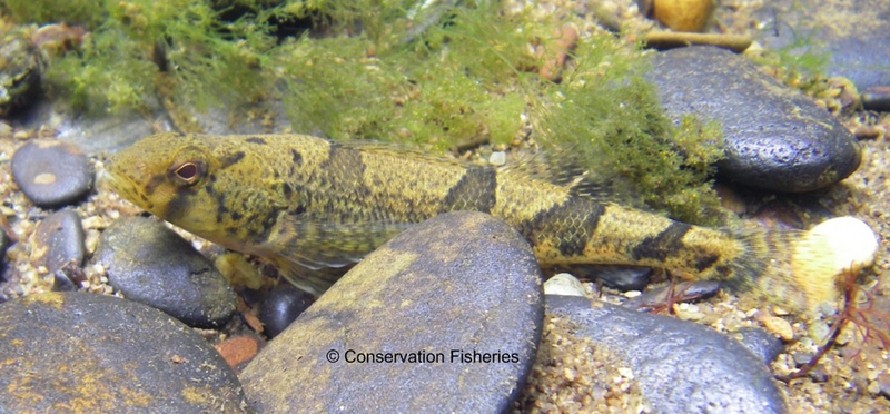 A small but robust fish reaching up to 90 mm (3.5 in) in total length, the snail darter is distinguished by four dark brown saddles that cross and contrast with the lighter brown dorsum. The saddles extend downward and join a lateral band formed by 9-12 indistinct blotches along each side. The eyes are positioned high on the head, with a dark blotch below each orbit. The dorsal and caudal fins are lightly banded, and on males the anal fin is noticeably elongated. Breeding males develop blue-green and gold coloration. The species name "tanasi" is for the name of the village on the Little Tennessee River that served as capital of the Cherokee Nation. The modern day derivation of tanasi is "Tennessee."