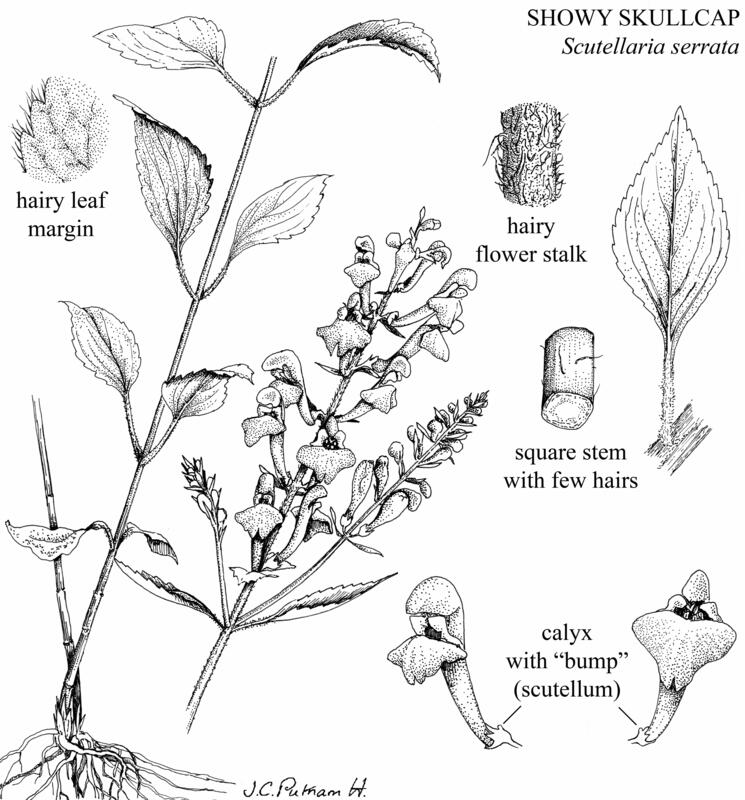 Southern Showy Skullcap (Scutellaria pseudoserrata, Special Concern) is distinguished by the upper surfaces of its leaves which are covered with glandular dots, and by its stem which has glandular hairs below the second set of leaves below the inflorescence. For more information, see: https://www.georgiabiodiversity.a2hosted.com/portal/profile?group=plants&es_id=19755