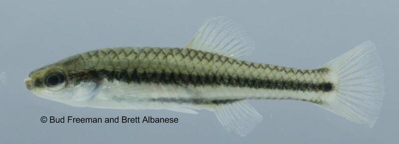 There at least 16 species of topminnows and killifishes in Georgia. These are mostly freshwater but also include brackish and saltwater species. Bluefin killifish are small, reaching up to 50 mm total length (2 in), with a slender, compressed body and a terminal, upturned mouth. This species has a dusky brown to olive back marked with darkly edged scales. A wide black stripe extends from the tip of the nose to the black spot at the base of the caudal fin. Adult males have brightly colored dorsal, caudal, anal and pelvic fins. Several color patterns (i.e., morphs) have been described and the pattern exhibited depends upon genetics and lighting environment. The dorsal fin has basal and marginal bands of black pigment and at least some blue in between these bands. The remainder of the dorsal fin may be blue, red, or yellow. The anal fin also has basal and marginal bands of black pigment, but the remainder of the fin may be red, yellow, blue, orange, or a combination of colors. The pelvic fins and the base of the caudal fin may be red or yellow. Nuptial males may also develop golden yellow coloration on the abdomen. In contrast to males, females have clear fins and do not exhibit bright breeding coloration (see photo below).