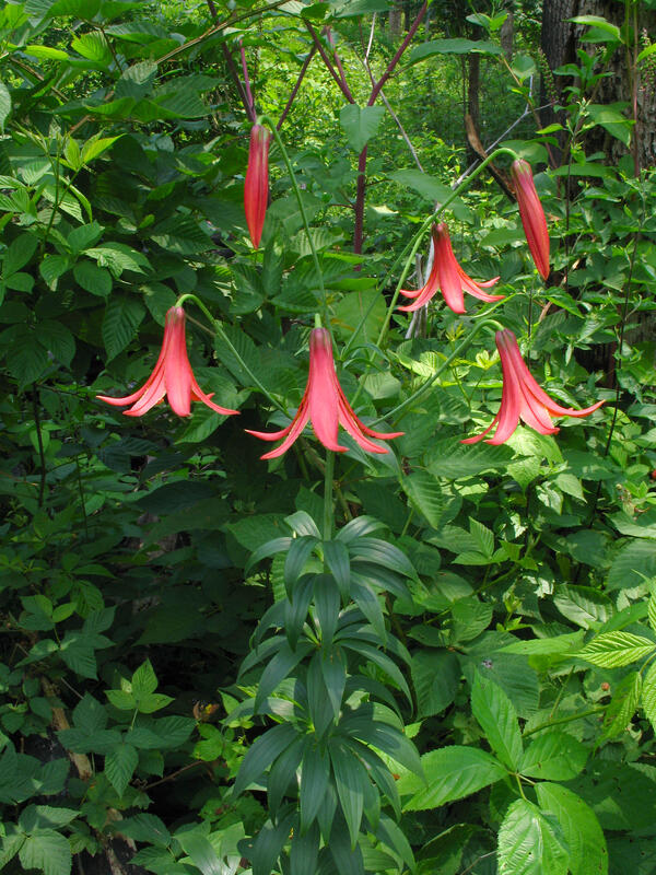 Lilium michiganense (Michigan Lily) occurs in remnant wet prairies and calcareous flatwoods in northwest Georgia. For more information, see: https://www.georgiabiodiversity.org/portal/profile?group=plants&es_id=15586