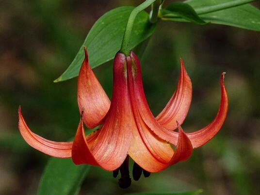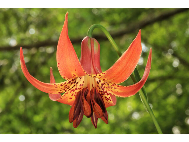 Turk’s Cap Lily (Lilium superbum) is common in moist forests in Georgia’s mountains and infrequent throughout the rest of Georgia, including in bogs and wet stream flats in the Coastal Plain. Its tepals are strongly curved upwards and curled under at the tips, fully exposing the 6 spreading stamens (that have cream-colored filaments) and the pale green style.