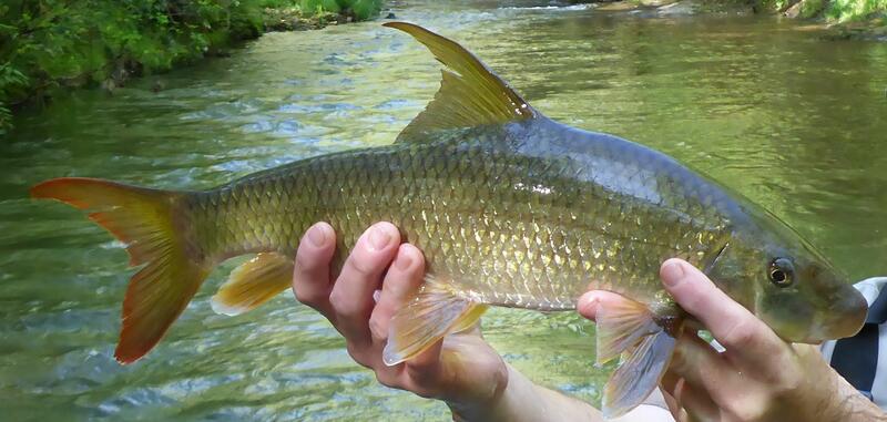 The sicklefin redhorse has a fascinating and complex life history, which has been documented for the Hiwassee River population by Robert E. Jenkins and researchers from the North Carolina Cooperative Wildlife Research Unit (Favrot and Kwak 2018). Adults are known to use the mainstem Hiwassee river below Mission Dam, North Carolina for feeding and over-wintering habitat. Males and females reach sexual maturity between ages 5 - 7 and 7 - 8, respectively. The maximum known age is 22 years. Adults migrate into larger tributary streams, including Georgia portions of Brasstown Creek, to spawn in the spring (late March-May) when water temperatures are 10-18 º C (49-64 º F). Spawning typically occurs over large gravel or small cobble in moderate to swift-flowing runs and riffles. Sicklefins typically engage in group spawning where up to 5 males crowd around one female during a single spawning act. Spawning involves intense quivering which results in the displacement of spawning substrate and the burial of at least some of the eggs. Radio-telemetry studies indicate that adult sicklefin redhorse migrate downstream to larger river habitats after spawning and may temporaily utilize reservoir habitats during migration. Very little is known about the ecology of larvae and juveniles, but their collection from the lower Hiwassee River and Hiwassee lake suggests that they may drift long-distances downstream from spawning sites. Juveniles have not been collected within Brasstown Creek in Georgia, which is consistent with downstream dispersal of larvae and juveniles.