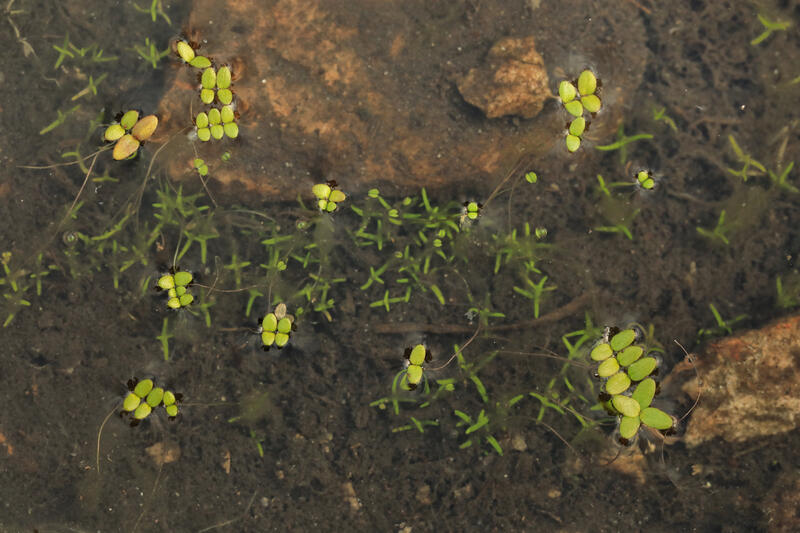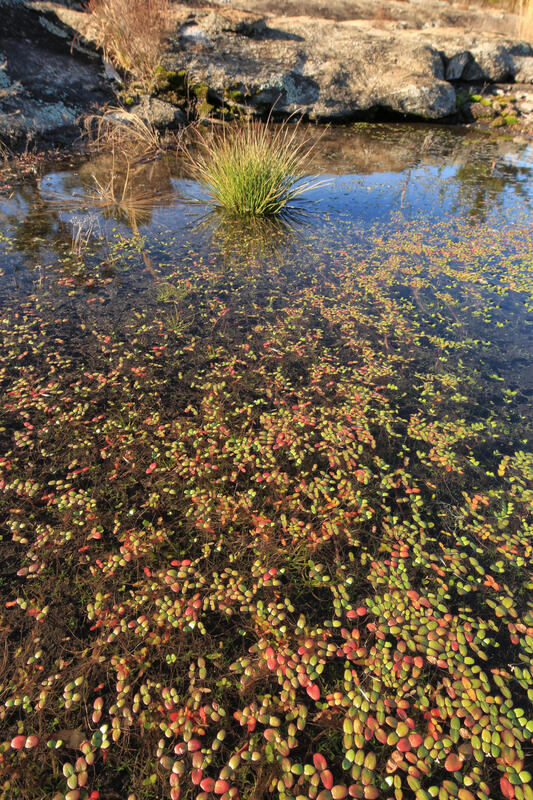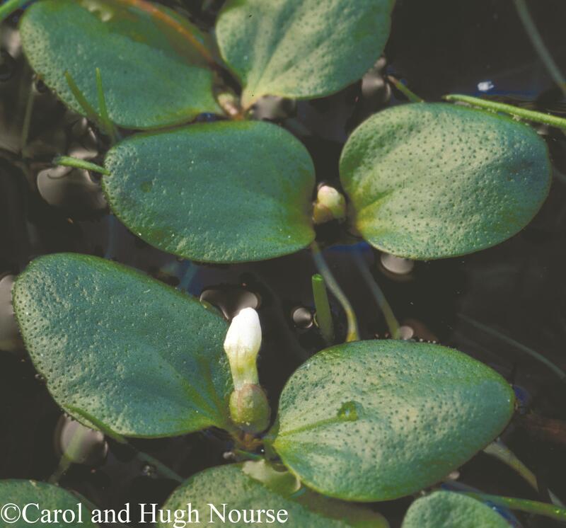 Water Starwort (Callitriche heterophylla) also occurs in pools on granite outcrops; its floating leaves are spoon-shaped and in whorls or rosettes rather than pairs; its submerged leaves are narrow and scattered along a long underwater stem.