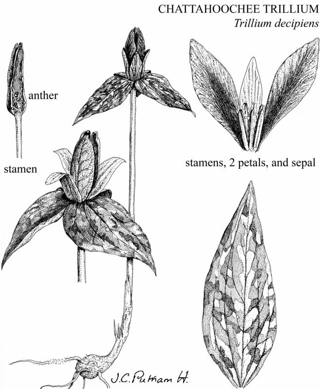Trillium decipiens is ranked S3? by the Georgia Department of Natural Resources, indicating that the species is rare in Georgia but that additional research is needed to confirm its rarity rank. Easily confused with robust or post-flowering plants of the more common Underwood’s Trillium, Chattahoochee Trillium was once thought to be abundant but is actually rare and found only within 20 miles of the lower Chattahoochee River. Ten populations have been documented in Georgia but only one has been confirmed since 2000.