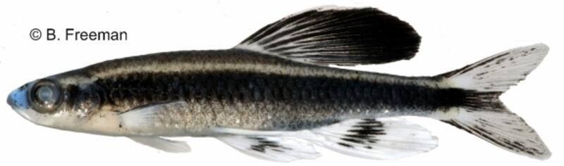 While nuptial male bluenose shiners are distinctive, non-reproductive individuals (see photo below) can be easily confused with several co-occurring minnow species. The ironcolor shiner (Notropis chalybaeus) differs in having a less prominent caudal spot, a 2-4-4-2 pharyngeal tooth count formula, and a dorsal fin origin that is positioned directly over its pelvic fin origin. The redeye chub (Notropis harperi) differs in having a small barbel and a 0-4-4-0 pharyngeal tooth count formula. The redeye chub also lacks pigment on its chin, which is an excellent character for sorting this species from the bluenose shiner in the field. The taillight shiner (Notropis maculatus) differs in having a distinctly rounded caudal spot, a 0-4-4-0 pharyngeal tooth count formula and a narrower lateral stripe. The bluenose shiner co-occurs with one congener, the Apalachee shiner (Pteronotropis grandipinnis) in Georgia. The Apalachee shiner is much more common and has a broader lateral band, a higher anal fin ray count (usually 10), and a completely pored lateral line.