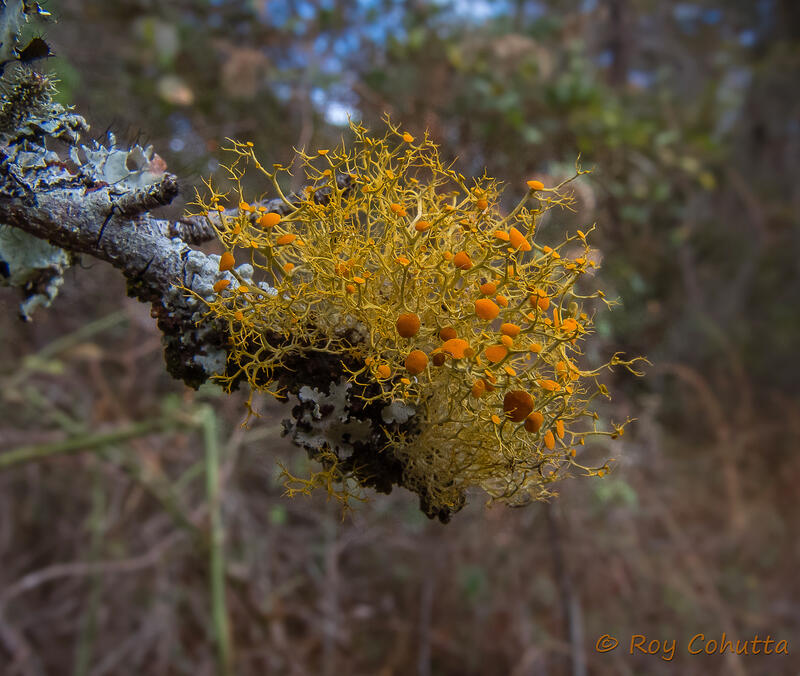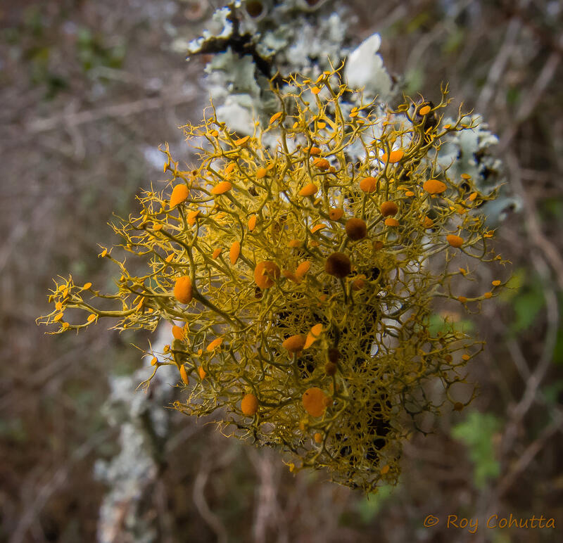 Teloschistes chrysophthalmus has broad, strap-like branches below narrow tips, & orange-ciliate rims on disks