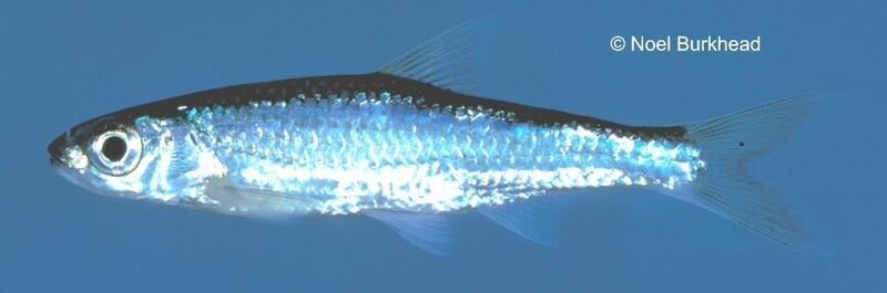 The popeye shiner is silver with very large eyes, a slightly pointed snout, and a large terminal mouth. The eyes are more than 1.5X the length of the snout. There are 9 anal rays (8-10), a 2-4-4-2 pharyngeal tooth count formula, and a dorsal fin that is positioned directly over the beginning (i.e., the origin) of the pelvic fins. In breeding males, the rays of the dorsal and caudal fins are distinctly outlined in black. The popeye shiner is a medium-sized minnow attaining a maximum total length of approximately 90 mm (3.5 in).