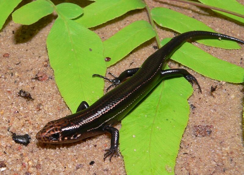 The mating season begins during the winter, usually by late January, and extends until early April. Males treat their mates rather rudely during courtship, biting them on the back of the neck and shaking them violently. Females typically lay four-eight eggs in the spring under cover or underground and remain with them until hatching, which takes place in midsummer. Sexual maturity is reached in two years. Coal skinks are active throughout the year. During the winter, these skinks come out to bask when air temperatures exceed approximately 13°C (55°F). These are ground-dwelling lizards, and, unlike Georgia’s other members of this genus, they typically do not climb. They forage in the leaf-litter zone of the forest floor and disappear underground when alarmed. Individuals may also enter water to escape predators. Documented predators include snakes, large lizards, and mammals. Coal skinks are like other lizards in that their tails break easily when attacked.