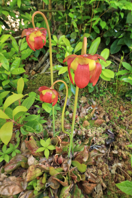 Mountain Purple Pitcherplant blooms April–May; its pitchers are distinctive throughout the growing season and even persist through the winter.