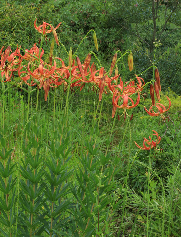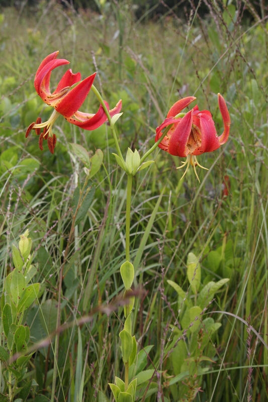 Turk’s Cap Lily also occurs in Coastal Plain bogs but is taller (up to 9 feet / 2.8 meters tall) than Sandhill Lily. Its whorls of leaves are distributed more or less evenly along the stem, without the scattered, single leaves at the top of the stem. Turk’s Cap Lily leaves are longer and blunter at the tips, and are either held horizontally or droop at the tips. Turk’s Cap Lily blooms somewhat earlier than Pineland Lily (early July–early August) and its flowers are intensely fragrant.