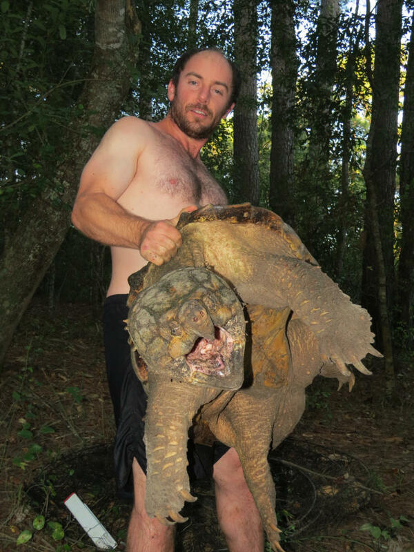 Snorkeling or SCUBA diving in clear water may be conducted to visually locate individuals, but deployment of large, heavy-duty hoop traps, particularly in blackwater systems with low visibility, are a more effective survey method. Trapping is ideally conducted March through November, when alligator snapping turtles are most active (individuals no longer forage for prey when the ambient air temperature falls below 18°C (65°F). Baited hoop traps should be set within and upstream of suitable habitat (i.e., adjacent to preferred microhabitats and within discernible to moderately flowing current). Within previous survey efforts, researchers have successfully used single-funnel hoop traps of various sizes, depending on field situations such as different water depths. Hoop traps should be positioned so that a funnel entrance is facing downstream, and so that the longitudinal axis of the hoop trap is approximately parallel to the stream flow with the current flowing through the throat of the trap, and should be baited with cut fish contained within a partially open vessel which is secured inside the back of the trap’s funnel throat and suspended into the approximate center of the trap diameter. At least the upstream and second trap hoops should be secured to the stream substrate (or large woody debris); if suitable rocks, limbs or root systems are unavailable for securing traps, staking may be required to secure the trap. To allow trapped animals, including alligator snapping turtles, to surface and avoid drowning, hoop traps should be positioned and secured so as to allow a portion of the upper part of the trap to be emergent from the water surface. Consideration should be given to the timing and feasibility of placement of traps on stream and river segments that could possibly experience rising flood water conditions, as stormwater flows could overtop set hoop traps, creating a drowning hazard for captured animals. Conversely, setting traps amid reduced stream discharge due to seasonality or drought could create a lack of flow rendering otherwise suitable habitats suboptimal, encouraging turtles to move to more stable habitats, limiting the success of trapping efforts. To maximize trapping results, hoop traps should remain in place for at least 12 to 20 hours, though they may be checked for captures as frequently as every hour or two, but no less frequently than every 24 hours so that captured animals can be removed, and to avoid escapes and drownings (previous research has shown that the majority of alligator snapping turtle individuals are captured within the first 24 hours of a trap set). Use of such turtle traps are only legal in Georgia by issuance of a permit by the Georgia Department of Natural Resources.