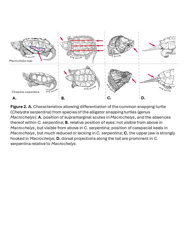 Among Georgia’s native turtle species, only the common snapping turtle (Chelydra serpentina) (within the same family, Chelydridae) could be confused with an alligator snapping turtle (genus Macrochelys); but common snapping turtles can be differentiated by the following: 1) both eyes are clearly visual from above; 2) dorsal projections along the tail are prominent relative to species of Macroclemys; and 3) possesses a carapace a) without supramarginal scutes, b) lacking prominent knobs on the vertebral or lateral scutes, and c) lacking keels at all or at least that extend the entire length of the shell (Figure 2).