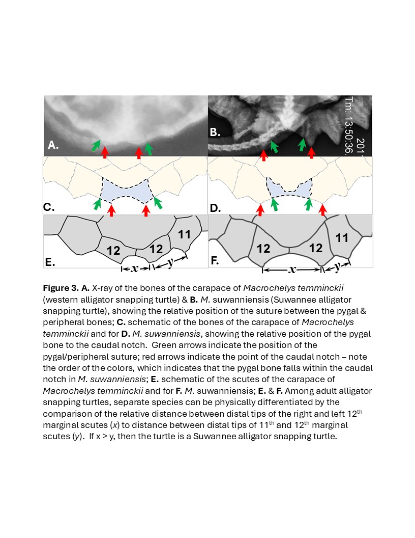 The Suwannee alligator snapping turtle can be differentiated from the western alligator snapping turtle (Macrochelys temminckii) by the respective species’ allopatric (non-overlapping) geographic distribution and through the comparison of shell characteristics, namely the 1) width and general shape of the caudal notch; and 2) the position of the “preabdominal” scute. Within Georgia, the western alligator snapping turtle occupies the lower Chattahoochee, Flint, and Ochlockonee rivers and their tributaries; the Suwannee alligator snapping turtle occupies the Suwannee River watershed. Among adult alligator snapping turtles, species can be physically differentiated by the comparison of the relative distance between distal tips of right and left 12th marginal scutes (x) to distance between distal tips of 11th and 12th marginal scutes (y) (Figure 3. E. & F.). If x > y, then the turtle is a Suwannee alligator snapping turtle. Since carapace morphology cannot be used to definitively determine a species identification for hatchling and juvenile alligator snapping turtles, and because the suture between the pygal and peripheral bones are discernible in radiographs (x-rays), if the geographic origin of a turtle is unknown, an x-ray of the posterior carapace may be necessary to determine the relative position of the pygal bone to the supracaudal scutes (scutes immediately adjacent and above the tail) and marginal scute cusps; for M. suwanniensis the pygal bone is completely contained within the caudal notch (Figure 3. A., B., C., & D.). Additionally, on the plastron, the “preabdominal” scute is laterally off-set relative to the abdominal scute in M. suwanniensis, but anteriorly off-set to the abdominal scute in M. temminckii (Figure 1.).