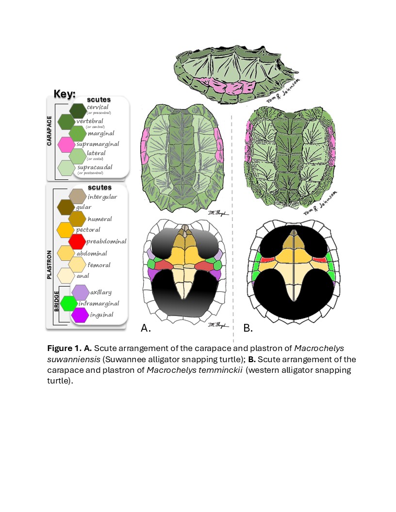 The Suwannee alligator snapping turtle was first described as a species separate from the western alligator snapping turtle (Macrochelys temminckii) in 2014. Currently, the largest documented alligator snapping turtle is a Macrochelys suwanniensis specimen (80.1 cm or ~31 inches maximum carapace length) making the Suwannee alligator snapping turtle (usually 30-50 cm or 12-30 inches carapace length in adults) the largest freshwater turtle species occurring in North America and arguably the fourth largest in the world, surpassed only by the Yangtze giant softshell turtle (Rafetus swinhoei) (100 cm or ~39 inches) of Asia, the Nile softshell turtle (Trionyx triunguis) (94 cm or 37 inches) of Africa, and the giant South American river turtle (Podocnemis expansa) (90 cm or ~35 inches). The generic name for the alligator snapping turtles is fitting, since Macrochelys means “large turtle.” As is the case for all chelydrid turtles (snapping turtles), this species has a total of 25 marginal scutes (including the cervical scute) on the perimeter of the carapace (upper shell). Both species of alligator snapping turtles have a row of three (occasionally more) supramarginal scutes situated between marginal scutes and the first three lateral scutes on each side of the carapace (Figure 1.). The carapace is large, rough, dark-brown, dark-gray, or sometimes yellowish, and strongly serrated posteriorly. There are three prominent keels running longitudinally along the length of the carapace, one down the center along the vertebral scutes, and a keel down each side of the carapace along the lateral scutes; there are knobs along these keels on each vertebral & lateral scute that are curved anteriorly. The largely reduced plastron (lower shell) is yellowish in color and characterized by off-set abdominal or “preabdominal” scutes (Figure 1.). The skin is dark brown to gray, but lighter below. The head is covered in elaborate papillae (small pimple-like fleshy projections) and the eye is ringed with conical tubercles (bumps of skin), all of which produce the effect of expertly camouflaging the turtle’s head with vegetation and woody debris typical of the species’ habitat. The upper jaw is strongly hooked. Hatchlings (3-4.5 cm or 1.25 - 1.75 inches carapace length) that look much like adults, have roughened carapaces, long, slender tails, and dark brown skin (sometimes possessing lighter mottling).