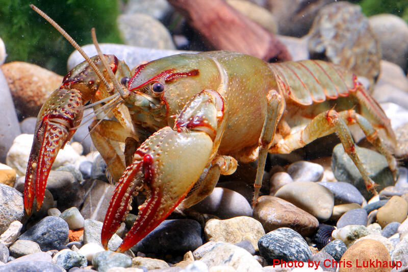 The overall color of the Devil Crawfish is light brown or tan to olive with abundant red highlighting. The fingers of the claws are red as well as the mesial margin of the palm. The rostrum and adjacent postorbital ridges are red as are the rear margins of each abdominal segment. There are typically three or more rows of tubercles along the mesial margin of the palm and the areola is obliterated. The rostrum typically tapers somewhat and does not have marginal spines or tubercles. The claws of adults of this species can be quite large and deliver a painful pinch. This species reaches a maximum total body length of about 96 mm (3.8 in). Note: First, Lacunicambarus was formerly a subgenus of the genus Cambarus but was elevated to the genus level by Glon et al. (2018). Second, recent taxonomic work suggests Devil Crawfish is a complex of species. Two described forms (Lacunicambarus dalyae and L. erythrodactylus) may occur in western-southwestern Georgia, replacing Devil Crawfish there (Glon et al. 2018; Simon and Morris 2015). Until additional fieldwork is completed to determine the distribution of these newly described species we will recognize all forms in Georgia as Devil Crawfish.