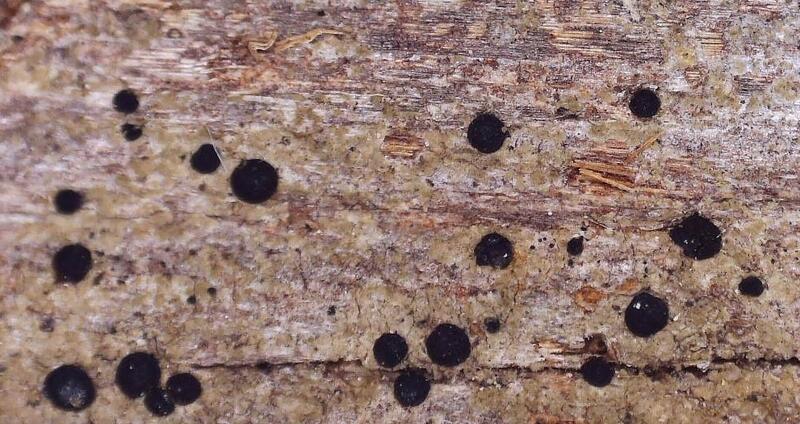 Tiny, flat, matte-black apothecia on bark, thallus thin, patchy, inconspicuous; MICROSCOPY: spores brown, 2-celled, about 15-20 x 8-12 µm, with walls conspicuously ornamented or roughened under high magnification, paraphyses with broadened, black-capitate tips, hypothecium dark brown; CHEMISTRY: no reactions to spot tests or UV; FIELD ID: obscure, tiny, easily confused with other tiny button lichens, unidentifiable in field with any certainty, requires dissection
