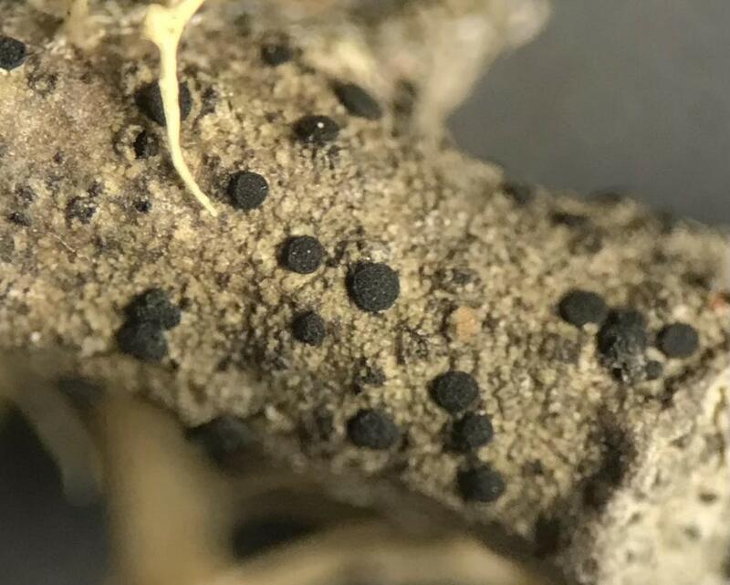 Tiny black apothecia on twig or branch bark, thallus dull green to brown; MICROSCOPY: spores brown, 2-celled, 24-32 spores/ascus; FIELD ID: black apothecia round, tiny, flat, with rough, matte-black surface, on dark green-brown thallus, on twigs; requires dissection to observe multi-spored asci, due to confusion with dotlets & other tiny buttons