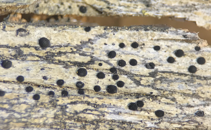 Tiny matte-black apothecia, thallus paler than bark but indistinct; MICROSCOPY: spores 8/ascus, brown, 2-celled, about 15.5-18 x 7-9.5 µm, unornamented; FIELD ID: obscure, tiny, easily confused with other tiny button lichens, unidentifiable in field with any certainty, requires dissection