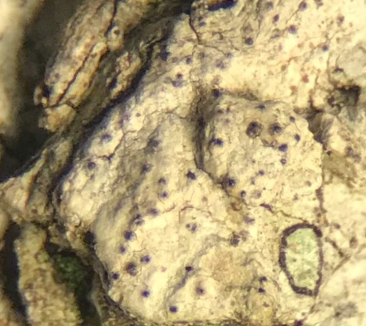 White crust on bark, with black perithecia partly or mostly obscured beneath thallus; MICROSCOPY: spores colorless, 1-septate, septum sub-median, slightly constricted, spores 15-20 x 5-6.5 µm; CHEMISTRY: thallus UV+ yellow (lichexanthone); FIELD ID: UV+ yellow reaction only narrows it down to 4 species; dissection required to observe spores