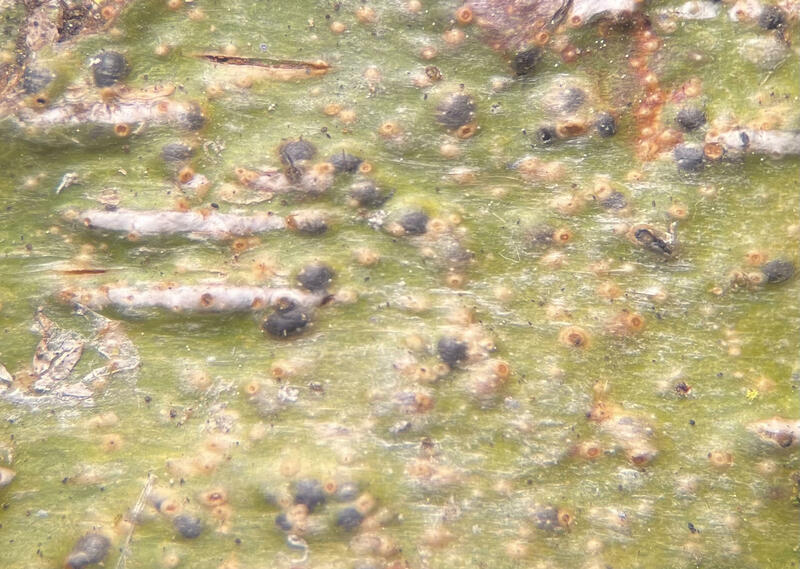 Gray, green or brown thallus with scurfy, pale, irregularly shaped pseudocyphellae; immersed perithecia visible as darker smudges with orange-brown lateral ostiole at center, or perithecia obscured by thallus with only ostiole apparent; MICROSCOPY: spores 2 per ascus, muriform with squarish locules, dark brown, thin-walled, lumina cylindrical, 130-180(-225) × 38-50 μm; FIELD ID: in examples with gray or green thalli & visible black perithecia (as in photo above), contrast of thallus color with perithecia & brown ostioles beside perithecia provide enough evidence for identification, with experience