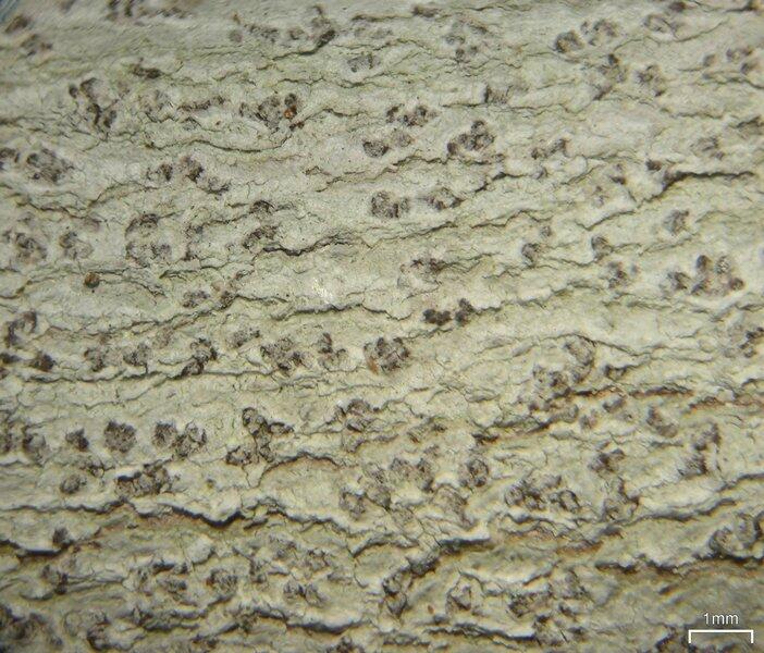 Pale thallus; variably shaped dark lirellae obscured by broken bits of bark or thallus; MICROSCOPY: spores with end cells enlarged & up to 16 cells; FIELD ID: not identifiable with certainty in the field, requires dissection to observe spores & photobiont