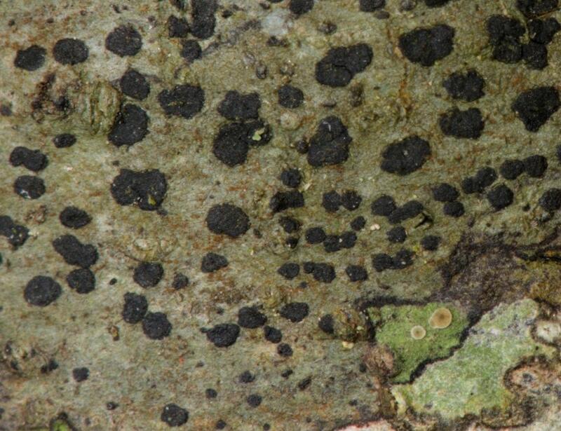 Brown or green thallus with flat, black, rimless disks; disks sometimes lifted at edges from thallus, and often irregular in shape; MICROSCOPY: muriform to submuriform spores as large as 23 x 10 µm; FIELD ID: the "blot" commas vary subtly in thallus color and blot shape, but can only reliably be told apart by dissection & chemical tests