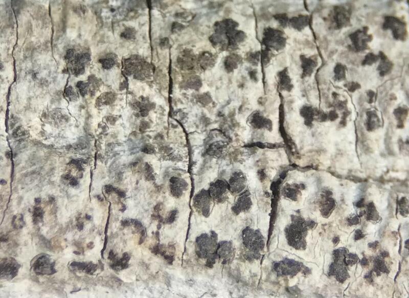 Whitish thallus with bold black lirellae, broad and irregular in shape; MICROSCOPY: spores muriform, 26-36 x 12-15 µm; FIELD ID: big splotchy irregular lirellae are identifiable in the field only with much experience; dissection usually needed to confirm ID