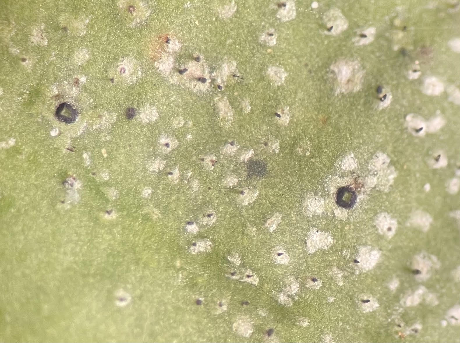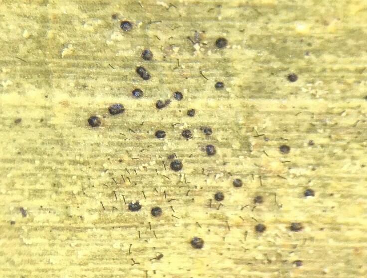 Obscure, tiny green thallus with black apothecia; disks low, softly angular (sometimes looking square), with a small, pale central disk; blunt, black hyphophores scattered around some thalli, absent in others, and some thalli without apothecia; FIELD ID: the leaf-whisker most commonly fertile in Ga.