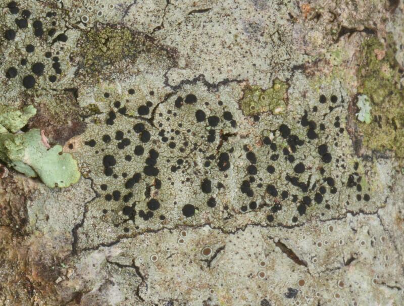 Pale green to whitish thallus with black disks; disks flat, rimmed black, the rim often thin & rising only slightly above the level of the disk (not consistent); MICROSCOPY: spores brown, 2-celled, consistently <15 µm long, with rounded tips (cells U-shaped), hymenium clear; CHEMISTRY: thallus K+ yellow turning red slowly (atranorin, norstictic acid) or K+ yellow (atranorin only); FIELD ID: the confusing array of black-dot lichens on bark require dissection to identify