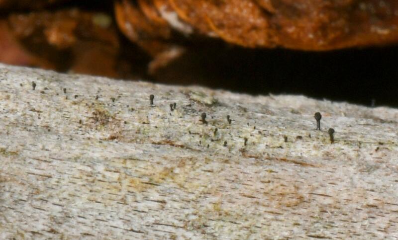 Calicium hyperelloides also has stalks over 0.5 mm tall, but its thallus is KC+ orange; C. salicinum has brown pruina on underside of apothecium & small, ornamented spores; C. trabinellum has a yellow-pruinose disk; C. abietinum has short stalks 0.1 mm tall, & black apothecia; other stubbles have either simple spores or persistent hymenia