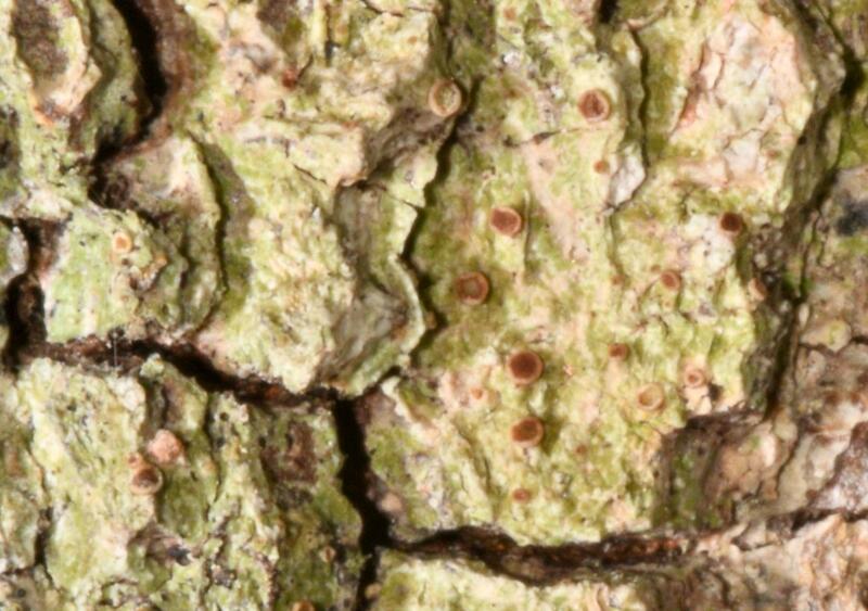 Corticolous crustose lichenized fungus, photobiont a green alga (Trebouxia?)