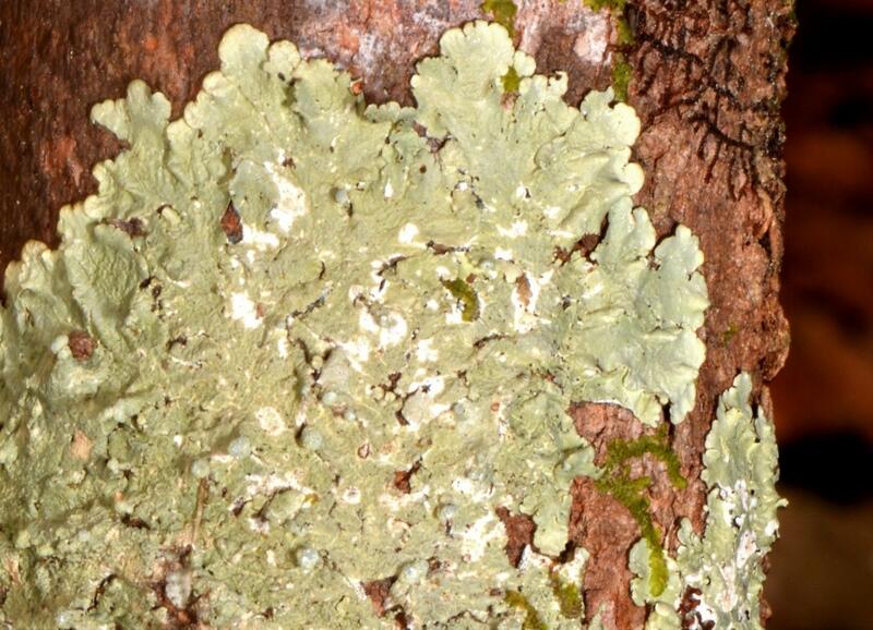 Medium-sized foliose lichen with pale gray thallus (yellow-green when wet), and lobes adnate to bark surface; lobe tips with white maculae, sometimes slightly raised from surface; margins on older parts of thallus with short lobes topped with globular soralia, sometimes sparse or absent altogether from young specimens; FIELD ID: sometimes best told from the side, when adnate lobes combined with big, raised globular soralia are unmistakable