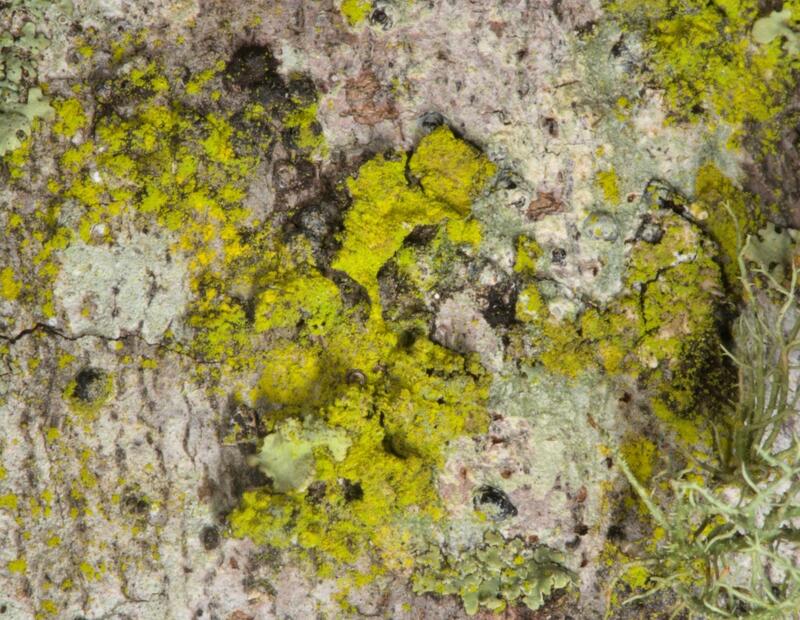Bright yellow leprose thallus, evenly distributed to patchy, scattered thinly or thickly layered, grading to yellow-green in deep shade; CHEMISTRY: thallus K-, UV-; FIELD ID possible, with K & UV tests