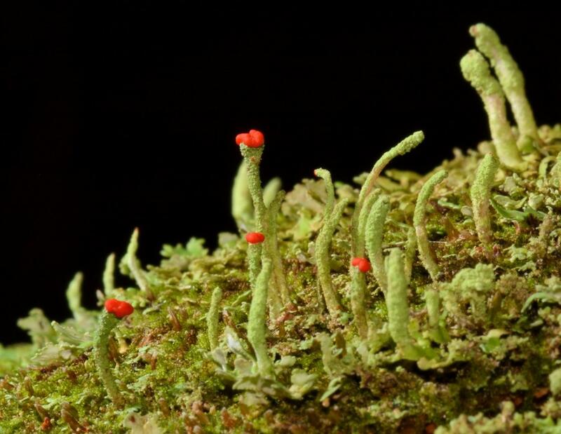 Cladonia didyma has isidioid granules or lobules covering its podetia, different from the powdery soredia of C. macilenta; other red-fruited Cladonia have corticate podetia (though some can have squamules, e.g., C. cristatella)