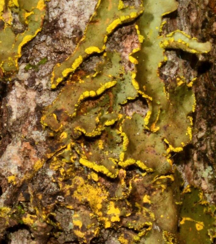Rich green (wet) or gray-green (dry) thallus with bright yellow sorediate edges of lobes; brown underside dotted with pseudocyphellae, exposing bright yellow medulla within; FIELD ID: unmistakable
