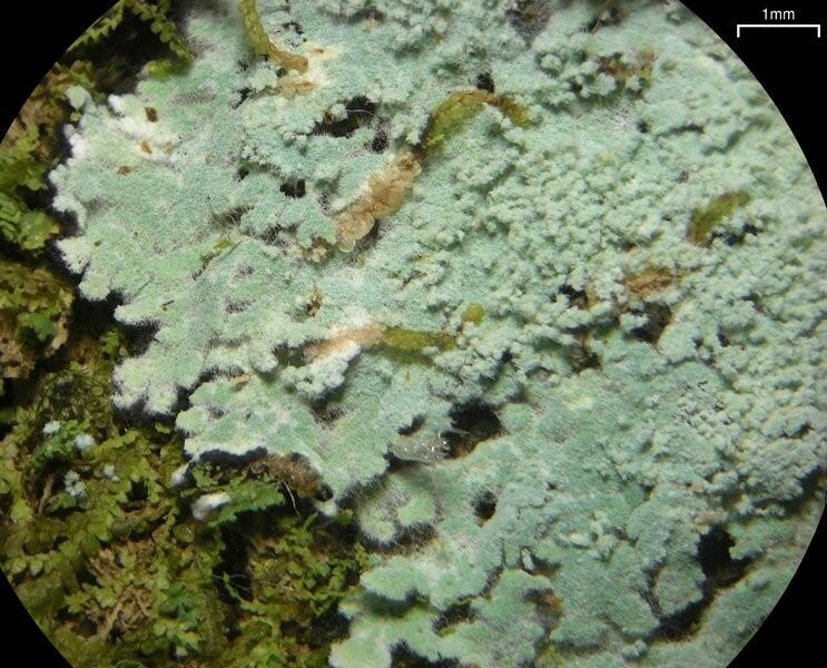 Pale gray-green to whitish thallus of tiny byssoid lobes, with black byssoid underside & prothallus; becoming sorediate at center of thallus; FIELD ID: appearing as a small foliose thallus superficially, but on close inspection the webbed, cottony thallus is obvious & distinctive