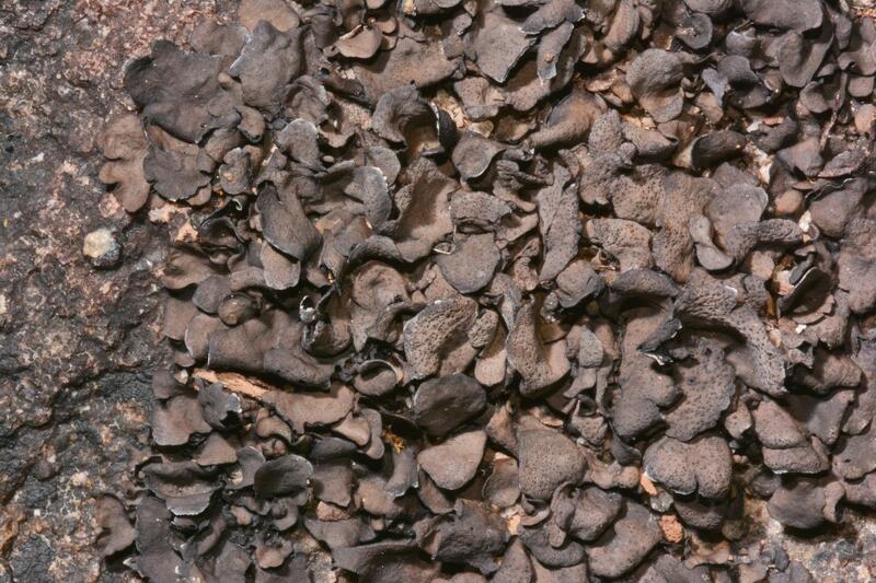 Brown (dry) or dark green (wet) thallus crowded with overlapping lobes 2-8 mm in width, stippled with dark ostioles of imbedded perithecia; lower surface black, smooth; multiple holdfasts attach lobes to rock; FIELD ID possible with experience, with habitat a clue