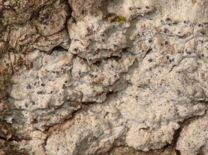 Whitish to creamy, ecorticate thallus with black perithecia showing beneath a variably thin layer of thallus; oval perithecia appear to lie on their sides, with round ostioles at one end; perithecia are frequently eaten (by mollusks?), leaving hollow pit with black perithecial wall at bottom; Microscopy: spores muriform; Chemistry: thallus UV+ yellow (lichexanthone); FIELD ID possible with careful observation: scrape thallus with a fingernail to detect yellowish sign of Trentepohlia photobiont, note oblong perithecia, & conduct field UV test (dissection recommended to observe spores)