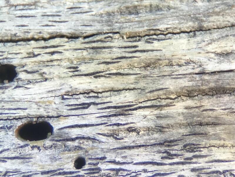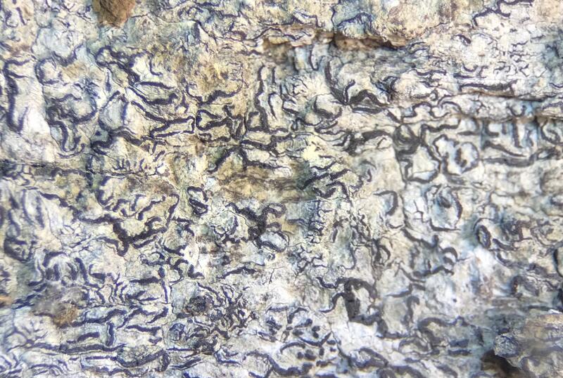 Whitish or gray thallus with sparse to crowded lirellae; lirellae up to 2 mm long, occasionally branched, broken by occasional dark crosswise fissures, with granular brown disks, variably pruinose; black labia even with disks & partially obscured by thalline covering; character of lirellae dependent on substrate, from straight & unbranched on wood to sinuous & branching on rough bark; MICROSCOPY: margin carbonized at apex, spores colorless, 5-8-celled, about 16-21 x 4-5 µm, cells cylindrical, filling spore to cell wall (not lens-shaped), spores thicker toward 1 end; FIELD ID: requires dissection to distinguish from lookalikes, especially given variability of thallus