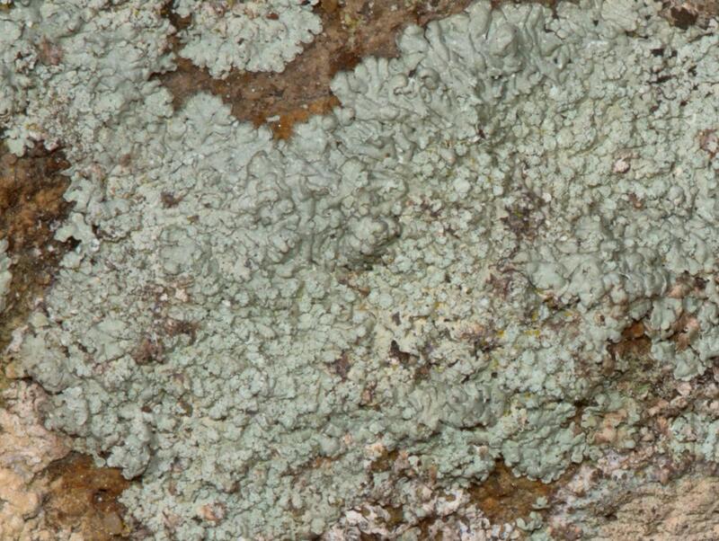 Crowded pale-green lobes tightly adhering to substrate, dividing to fill all space as lichen grows out; older parts of thallus with mounded, discrete soralia; no rhizines on black underside; FIELD ID: unmistakable if carefully observed
