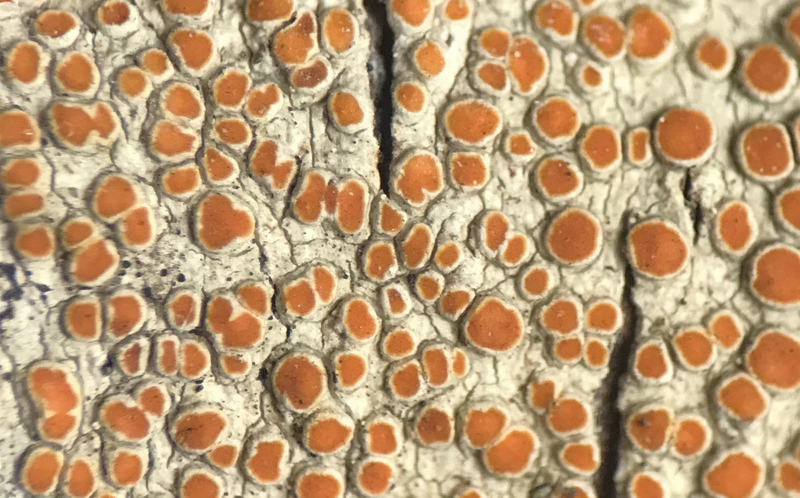 Pale green or whitish thallus with orange disks; disks even with smooth rims, crowded, merging on contact; never sorediate; MICROSCOPY: sinuous, colorless spores consistently 6-7-celled in maturity; CHEMISTRY: disk K+ deep burgundy-red (russulone); FIELD ID possible with experience; note differences with H. rufidulum (see Similar Species), & take caution that species with haematommone can appear to have orange disks when wet
