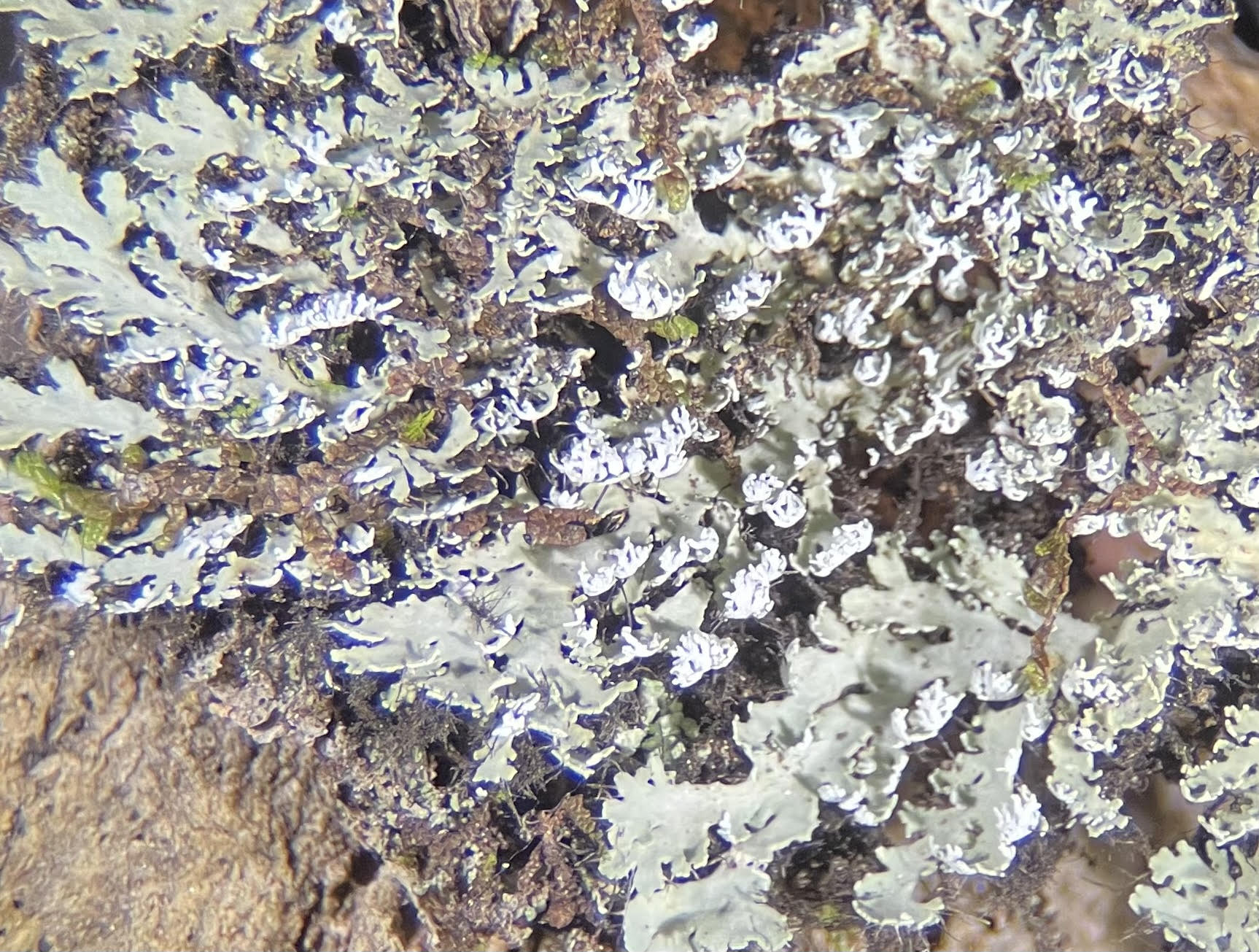 Pale green lobes, edges crowded with proliferation of small lacy squamules; some squamules curling up to expose white undersides (perhaps only when dry); lobe margins fringed with cilia-like rhizines; underside ecorticate, white at tips, grading to purplish-black at center; FIELD ID: unmistakable