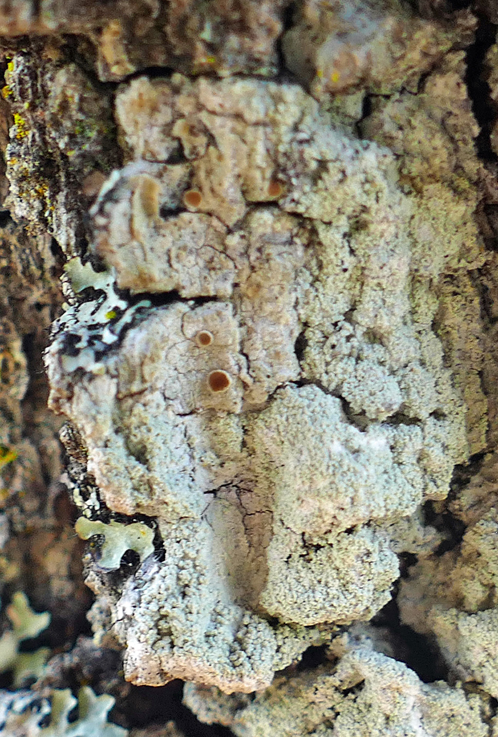 Corticolous crustose lichenized fungus, photobiont a unicellular green alga (Pseudotrebouxia)