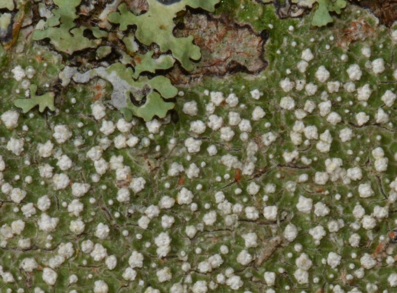 Corticolous crustose lichenized fungus, photobiont an alga in Trebouxia