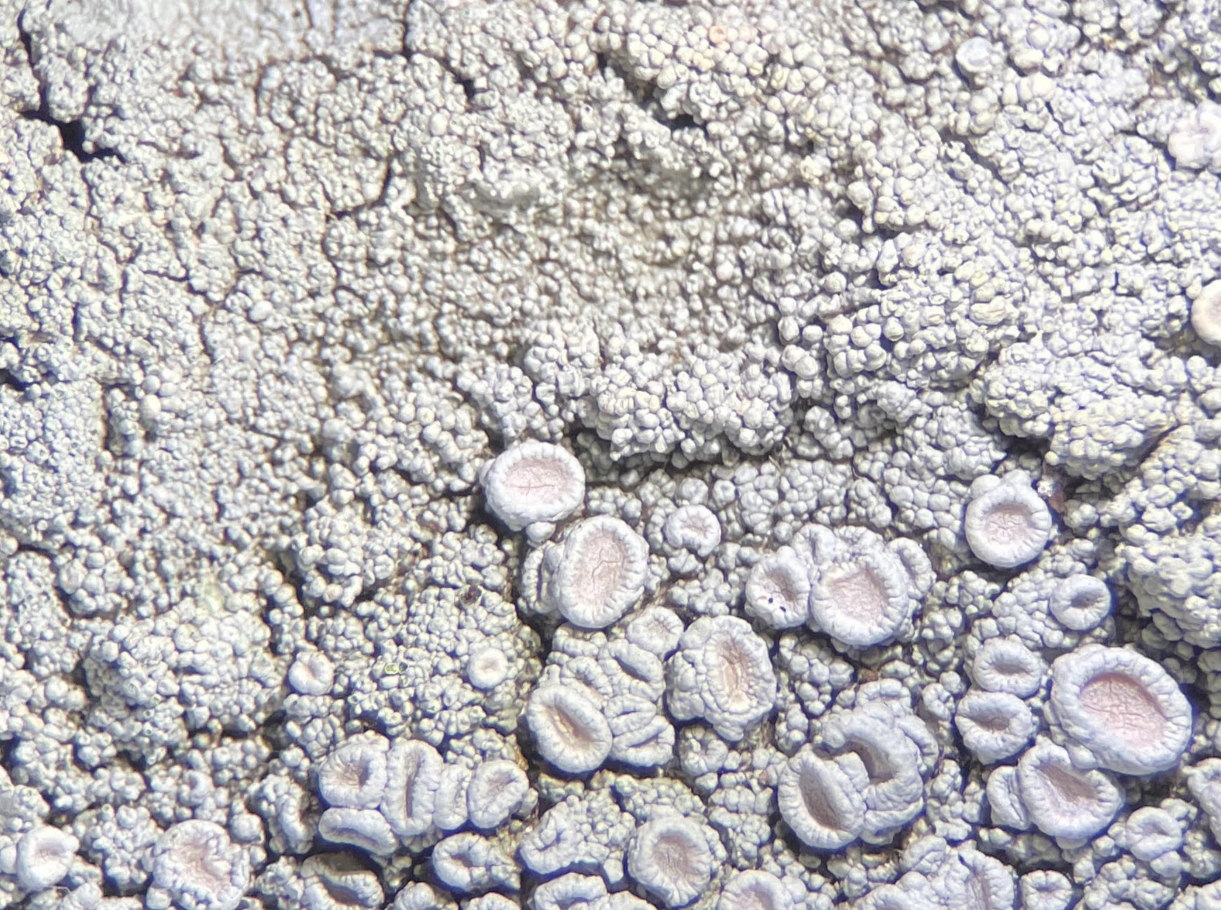 Saxicolous /corticolous crustose lichenized fungus, photobiont a green chlorococcoid alga (Trebouxia?)