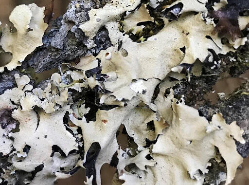 Pale green-gray thallus of broad (1cm wide) main lobes & strap-like side lobes 1-2 mm wide; lobe surfaces covered with dense, reticulate pattern of minute cracks; undersides brown at lobe edges, black in center, with dense growth of long rhizines to lobe edges; lobes with abundant, long black cilia; apothecia common to rare (look for tiny buds on thallus surface), brown cups, with or without central perforation; CHEMISTRY: medulla K+ blood red (salazinic acid); FIELD ID: given abundance of Parmotrema perforatum complex & P. submarginale, take care to check undersides for color & position of rhizines, & upperside for reticulate cracks