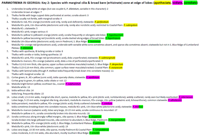 Pale gray-green to yellow-green thallus of small, fairly adnate lobes about 1.5-3 mm wide; undersides brown & without rhizines at lobe edges, black in center; old lobes with abundant isidia, cylindrical to branched, not topped with cilia; lobes with sparse, short black cilia at edges, mostly in axils of lobes; CHEMISTRY: medulla K+ yellow, C-, KC+ pink, UV- (stictic acid, norlobaridone); FIELD ID: most in Similar Species below are much larger except Parmotrema subisidiosum, which can be eliminated with a look at the undersides & a field K test to the medulla